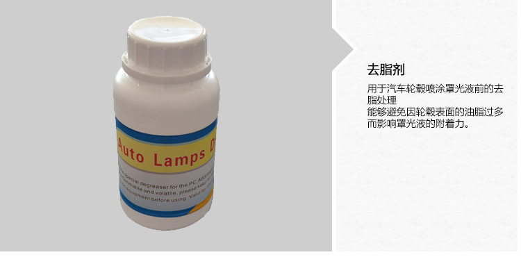 | LG-012 | 去脂劑 | 用于汽車輪轂噴涂罩光液前的去脂處理,能夠避免因輪轂表面的油脂過(guò)多而影響罩光液的附著力。 | 1(瓶) | ![]() |