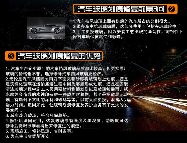 效果好:以汽車擋風玻璃為例,深度不超過100微米的劃痕,修復后清晰度和透明度達到玻璃原有程度,造成的光畸變小于1分,符合國際標準。