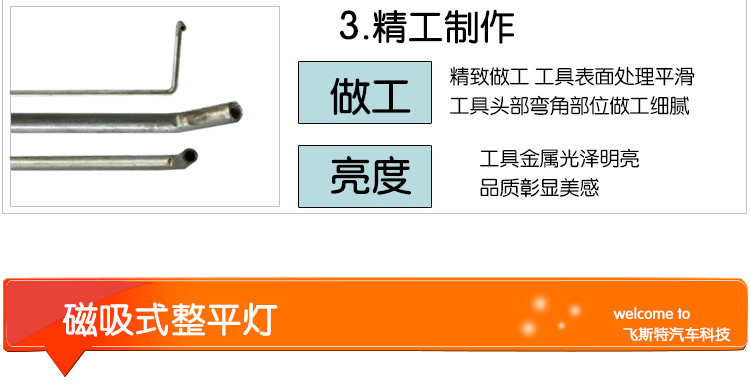汽車凹陷修復工具主要的要有圓潤度并且柔韌度大于硬度才能讓修復輕松自如,才能合理的利用杠桿原理,但是做到這幾點需要專用的生產工藝和特殊的材質才能達到滿意的效果,市面的仿制品都是手工研磨,所以 給使用者制造了很大的使用難度或直接沒法正常使用,我公司引進日本先進的冷壓生產工藝,國內一家凹陷修復工具配有專用拉拔器,設備盡顯細節(jié),能夠達到不錯的修復效果。